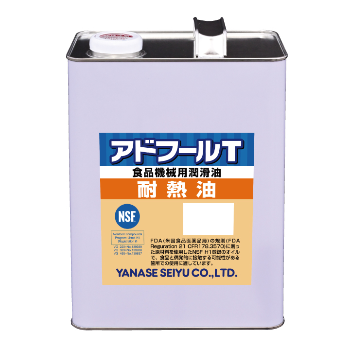 アドフールT 耐熱油は、FDA(米国食品医薬品局)の規則(FDA Regulation 21 CFR 178.3570)に則った原材料を使用したNSF H1 登録の食品機械用潤滑油です。