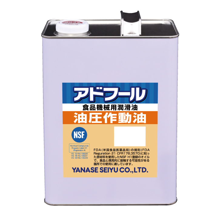 アドフール油圧作動油は、FDA(米国食品医薬品局)の規則(FDA Regulation 21 CFR 178.3570)に則った原材料を使用したNSF H1 登録の食品機械用潤滑油です。